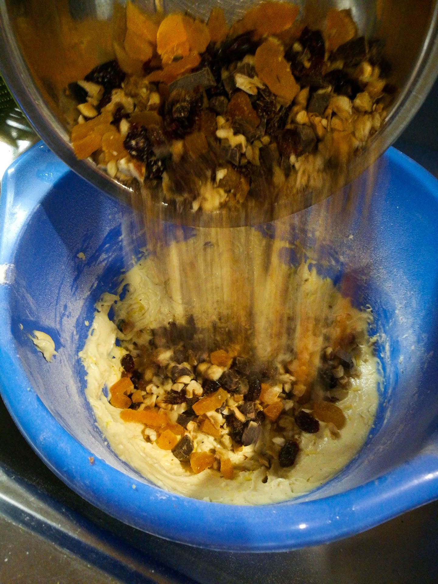 - Prosijte brašno s praškom za pecivo te ih dodajte u smjesu šećera, jaja i maslaca. Promiješajte dok ne dobijete gušću smjesu, a potom umiješajte orašaste plodove i čokoladu koje ste nožem usitnili na manje komade te usitnjeno kandirano voće po želji.
