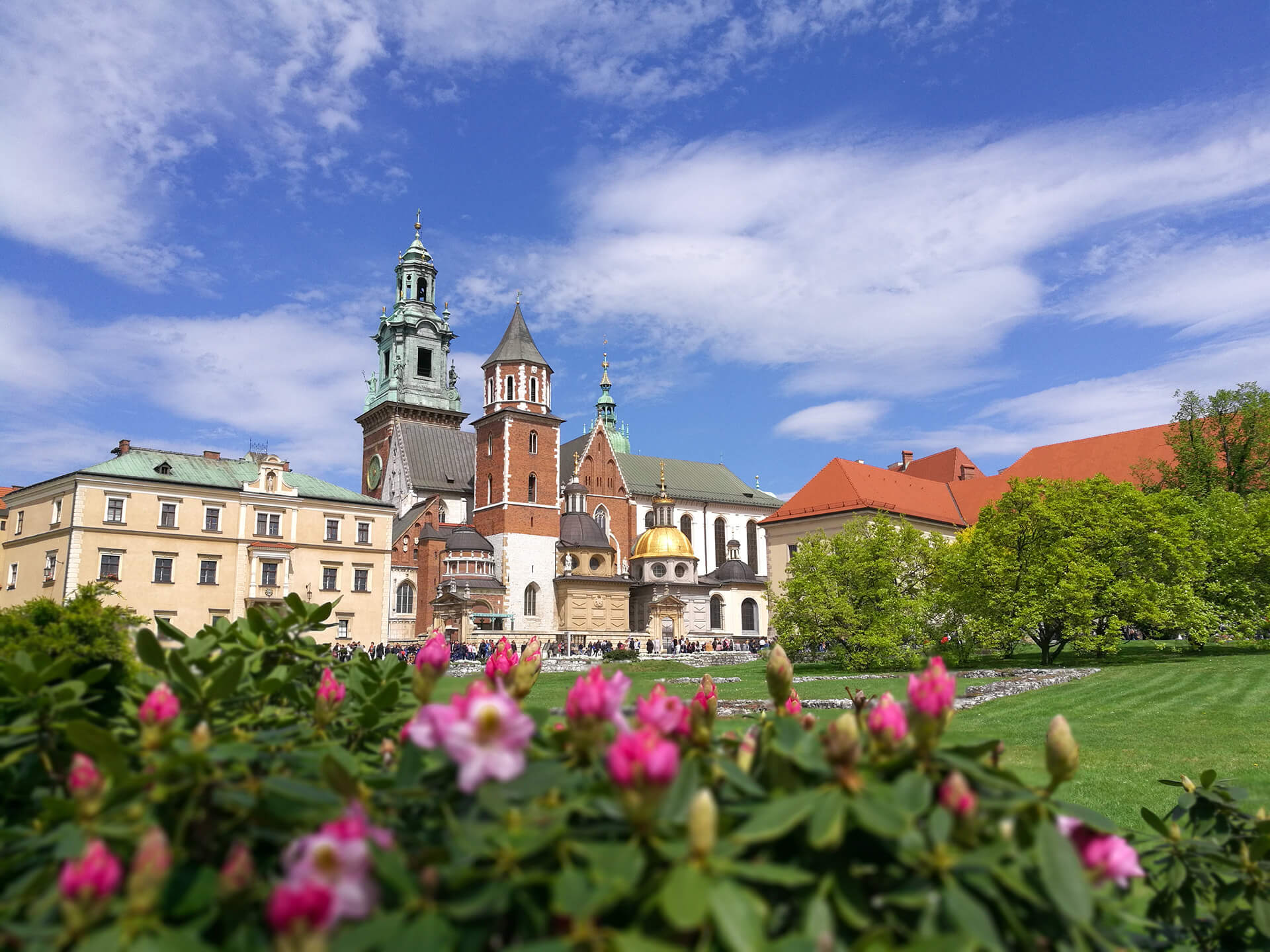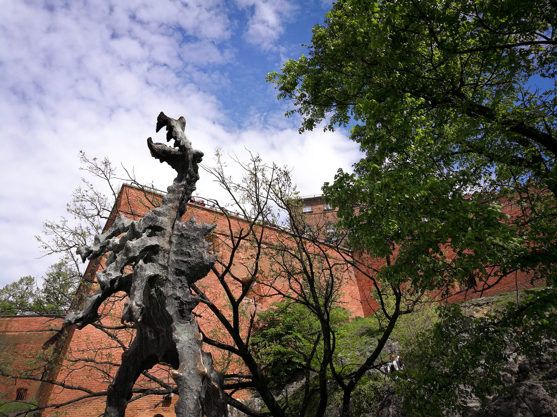Prolazimo pokraj jedne krakovske atrakcije – kipa zmaja koji riga vatru. Navodno. Zašto? Čekali smo i čekali, ali vatru ugledali nismo. Možda je do kiše. Možda. Lagana uzbrdica i eto nas na predivnom platou. Cvijeće, skulpture, zgrade. Posebno se ističe Katedrala. Mislili smo kako je ulaz besplatan, ali naravno morali smo ga platiti. Prolazimo kroz katakombe. Dolazimo u unutrašnjost crkve, visoki svod, relikvije, gužva. Lijepa crkva za vidjeti.