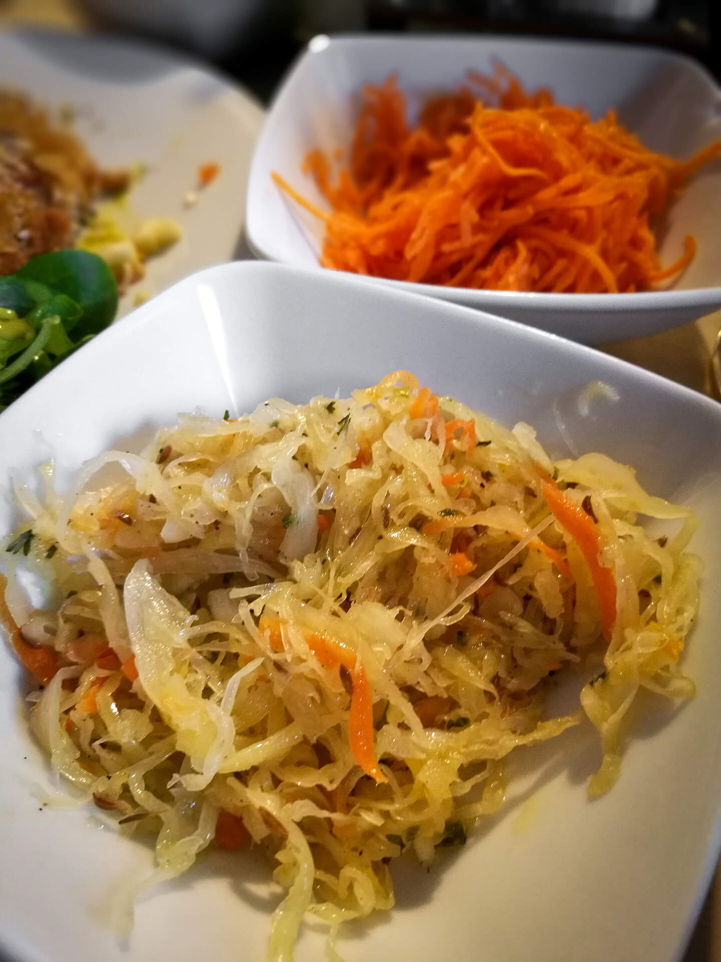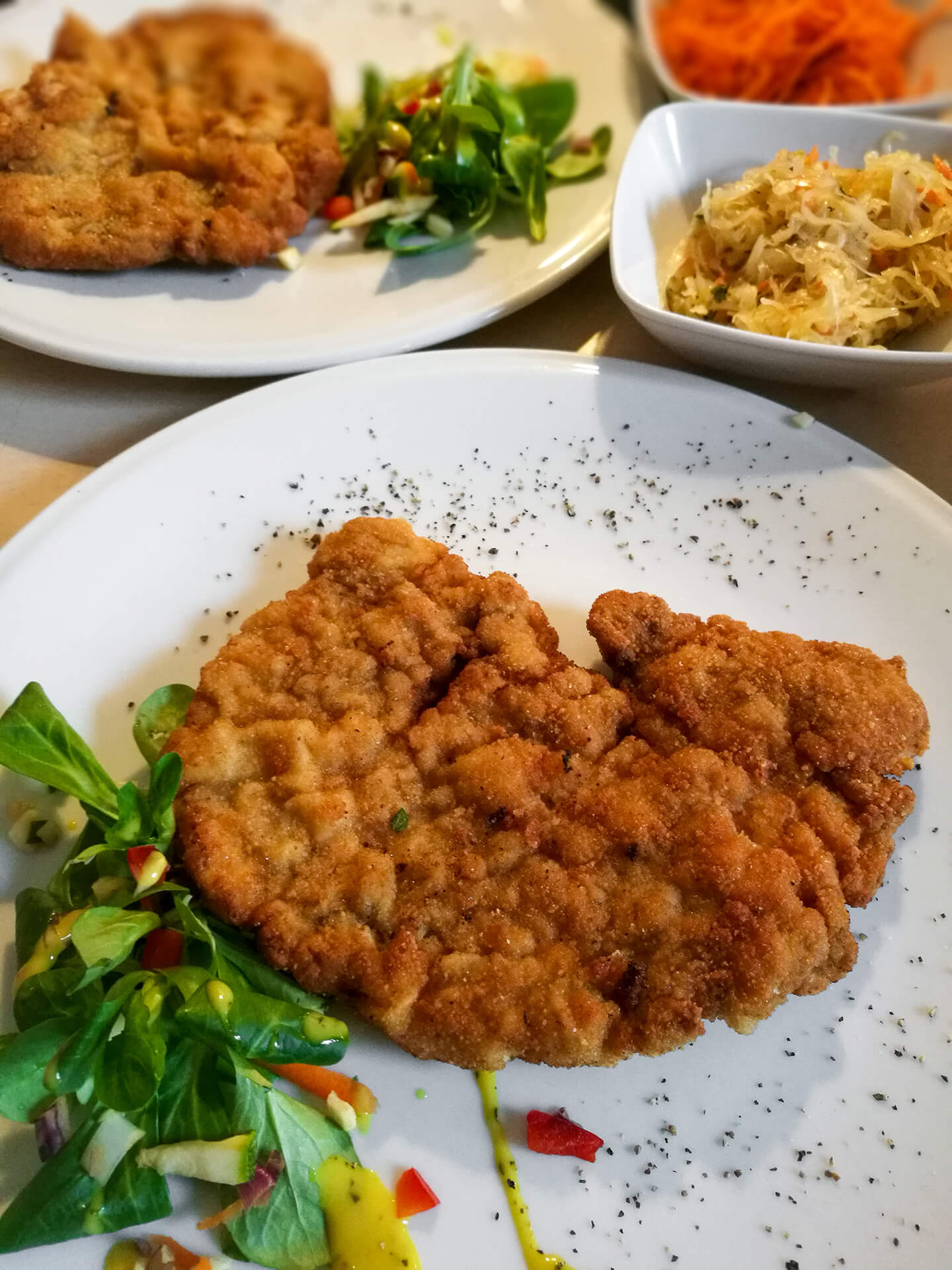 Polako ali sigurno došlo je vrijeme ručka. Toni kaže kako zna jedno dobro mjesto u židovskoj četvrti pa se odlučujemo na malo duže hodanje. Omanji restorančić izgleda obećavajuće. Uređen u IKEA stilu, svijeće i cvijeće na stolovima, pomalo intimna atmosfera. Uzimam jelovnik i gledam što još nisam probao od poljskih specijaliteta. Odgovor se nameće sam po sebi vrlo brzo. Kotlet Schabowy ne može biti loš odabir, a uz njega još ide u Surowka. Da pojasnim o čemu se radi. Schabowy je nešto kao bečki samo što se u poljskoj verziji koristi lungić. Ono što me apsolutno oduševilo bila je Surowka. Salata od ukiseljenog povrća fenomenalnog okusa. Postoje različite kombinacije, a ova je bila veličanstvena. Kiseli kupus, mrkva, jabuka uz dodatak cijelih sjemenka kima nevjerojatno je pasala uz teški pohani šnicl. Popili smo pivu, pojeli pa je bilo vrijeme da se Iva i ja uputimo dalje svojim putem.