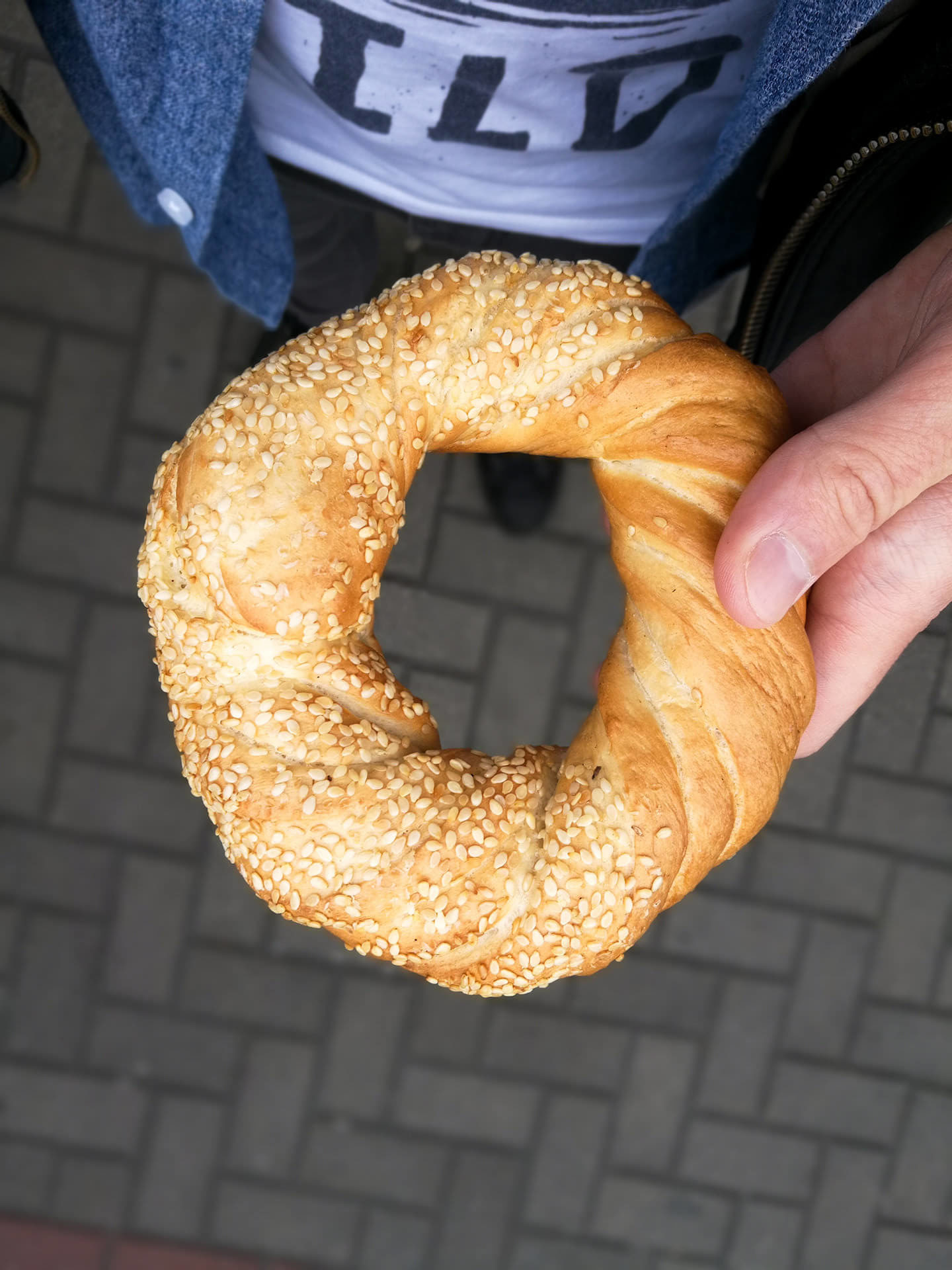 Hodamo. Gledam lijevo i desno ne bi li pronašao kakvu pekaru. U daljini se nazire plavi štand. Starija žena stoji šćućureno ispod nadstrešnice štandića pokušavajući ne pokisnuti. Odlazim iz sigurnog skrovišta kišobrana prema štandu jer znam da je tamo ono okruglo pecivo koje želim kušati. Obwarzanek je poljsko pecivo posipano makom, sezamom i slično. Ono što je Njujorčanima bagles, to je Poljacima Obwarzanek. Biram onaj sa sezamom. Ipak ne želim jezikom čistiti zube od crnih makovih zrnca čitavo jutro. Spremam pecivo i u tom trenutku čujem kako Iva viče.