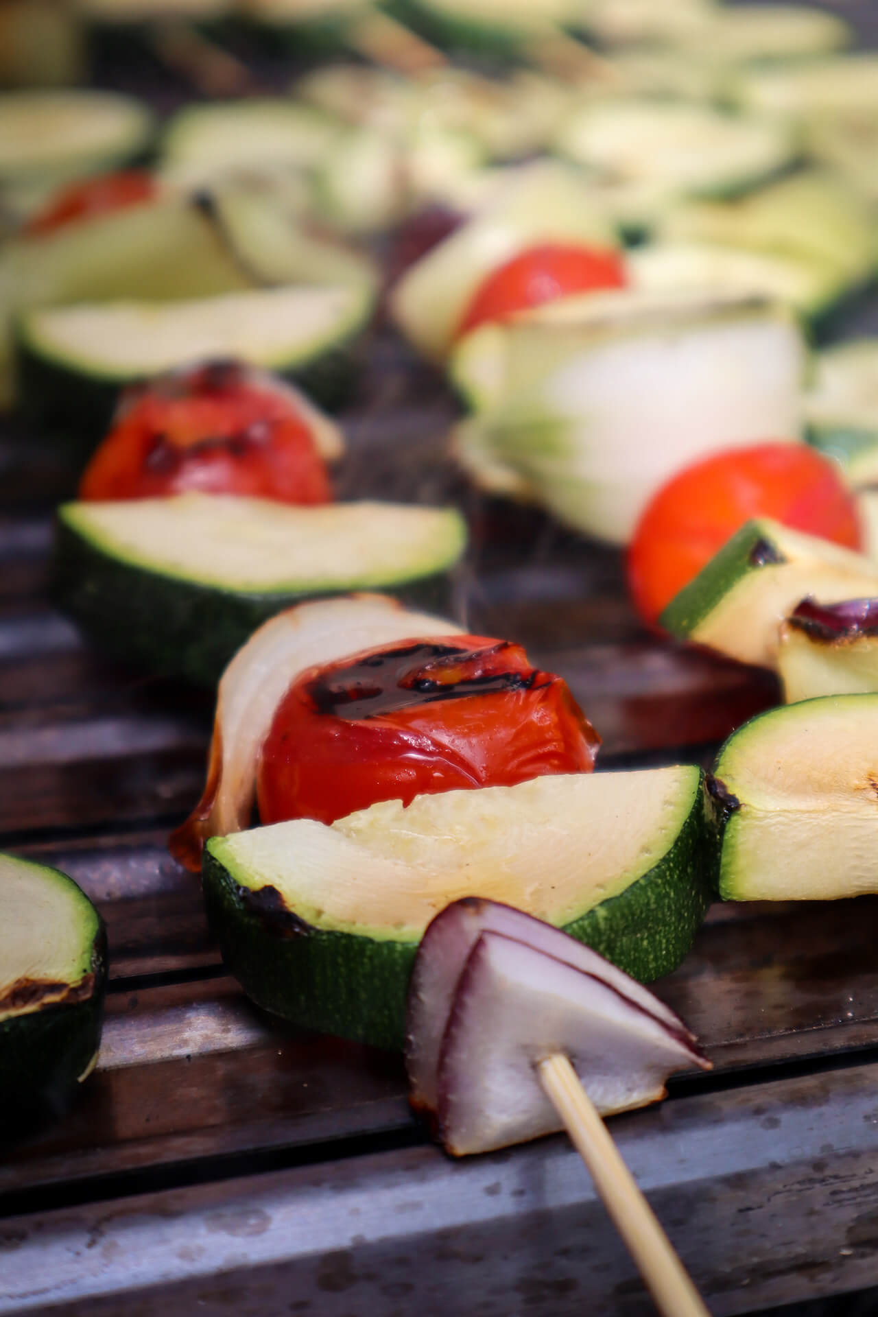 - Povrće narežite na kockice i nabodite na štapiće za ražnjiće te lagano namastite maslinovim uljem i pecite na roštilju dok ne omekša.
