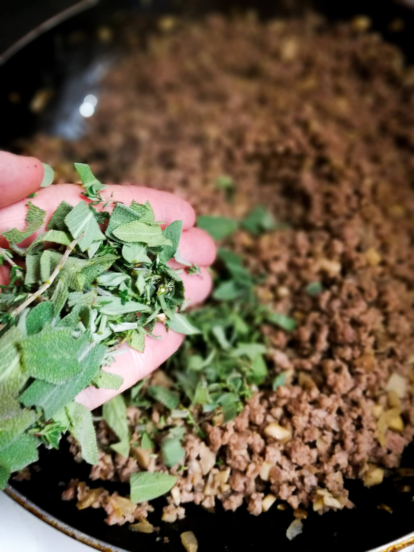 - Dodajte natrganu kadulju i listiće timijana (količinski koliko želite da se jako osjete), sol, papar i pinjole koje ste prethodno malo tostirali te sve pustite još kratko da se sjedini. Ostavite da se ohladi.