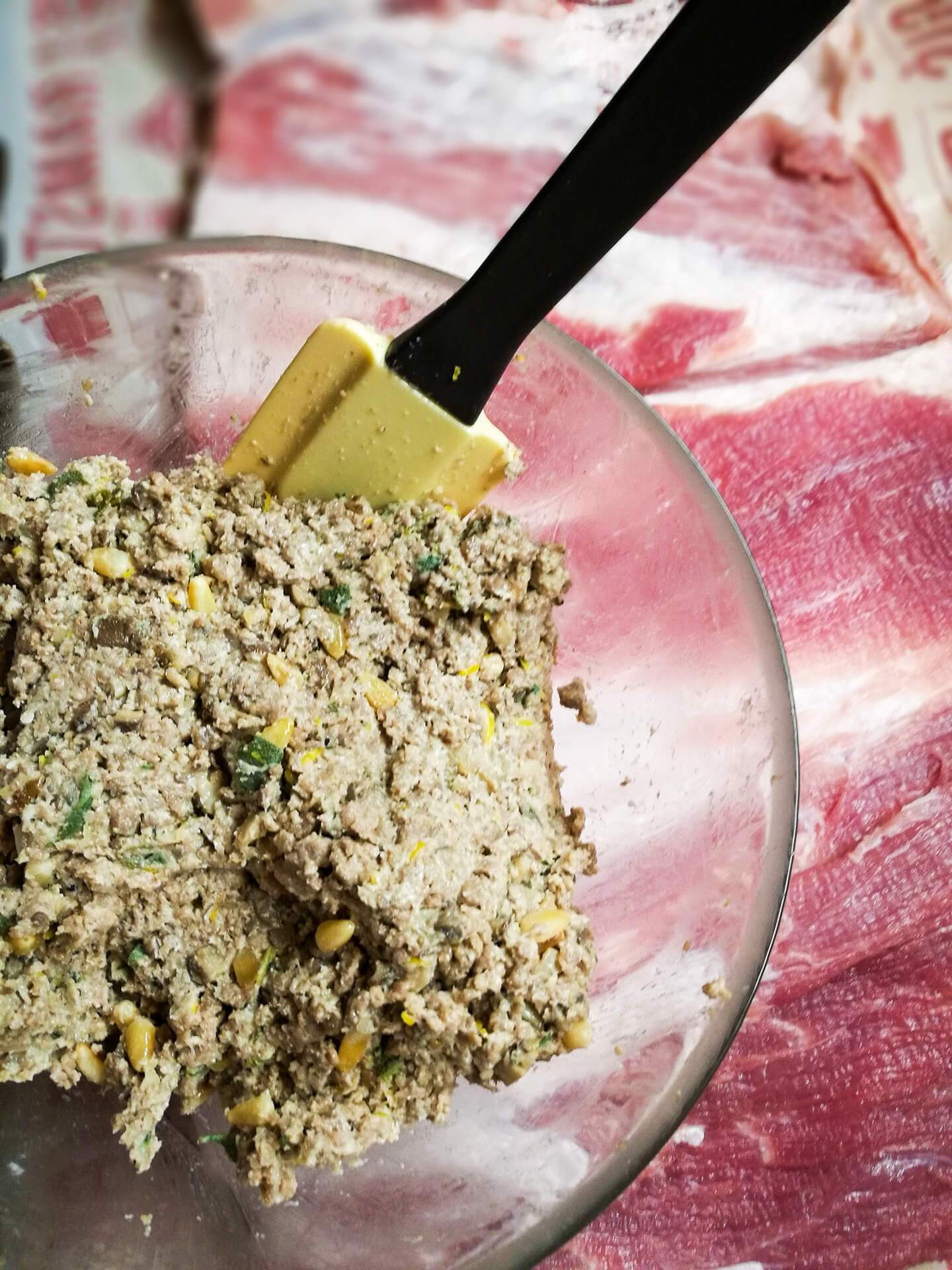 - Pri kupnji potrbušine zamolite mesara da odvoji kosti i rastvori potrbušinu kao knjigu s obje strane kako biste dobili što veću površinu za rolanje. Kako nafilati i zarolati meso pogledajte u videu https://www.youtube.com/watch?v=gZkLKVYG3WY. Zarolano meso dobro posolite s vanjske strane.