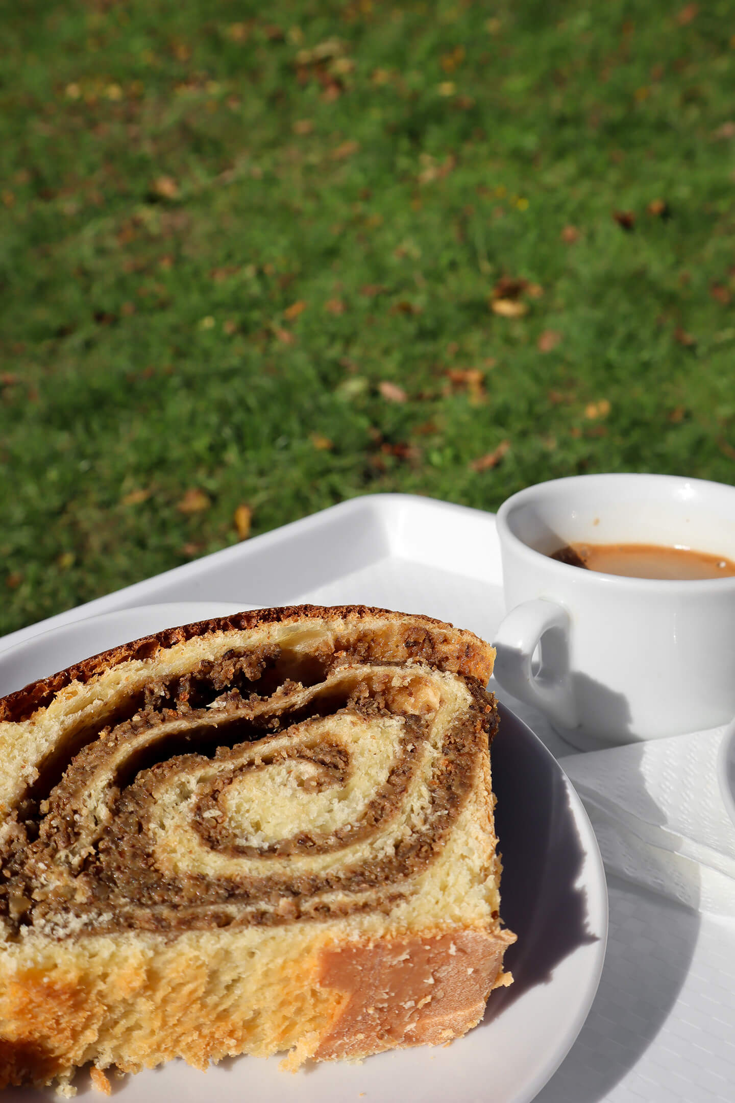 Uzeo sam i jednu orahnjaču. Tijesto je bilo solidno, iako je na prvu djelovalo suho. Ono što izvlači cijeli dojam svakako je fila, kao i kod Risnjaka. Posebno mi se sviđa što orasi nisu sitno mljeveni već su ostali veći komadi koji hrskaju pod zubom. Omjer file i tijesta je bio pravilan i izgledom je stvarno bila lijepa. Teta Mina ovdje definitivno ne bi prigovarala da ima premalo file. Malu kavu s mlijekom platio sam 8 kn.
