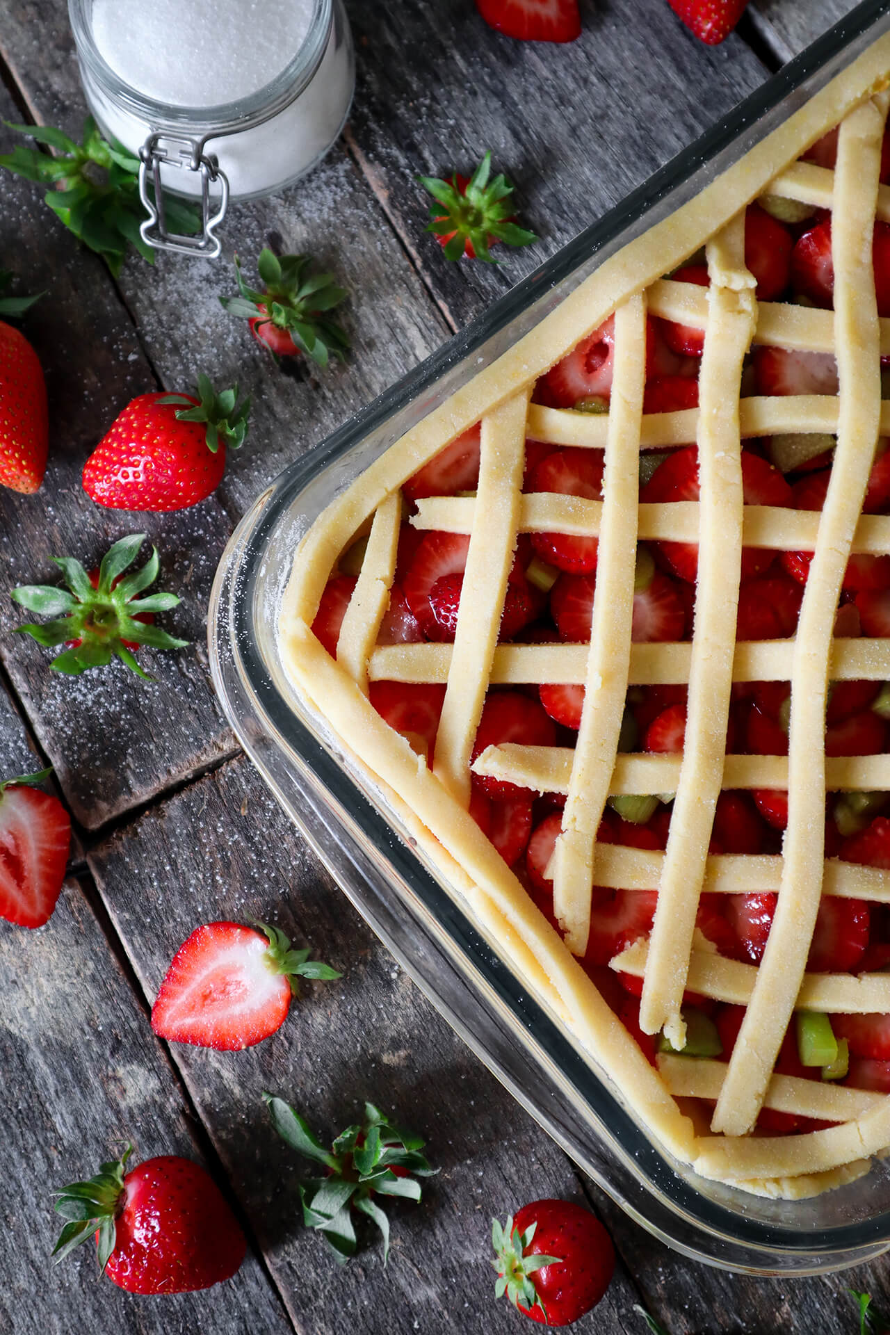 - Na tijesto nanesite punjenje od jagoda i rabarbare, a zatim trakice složite cik-cak.