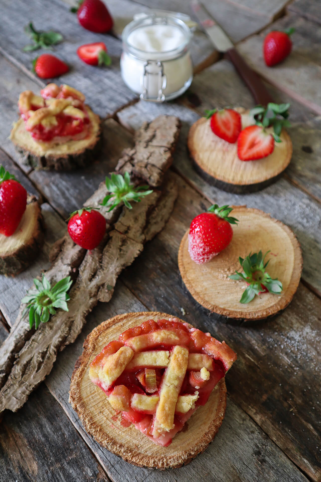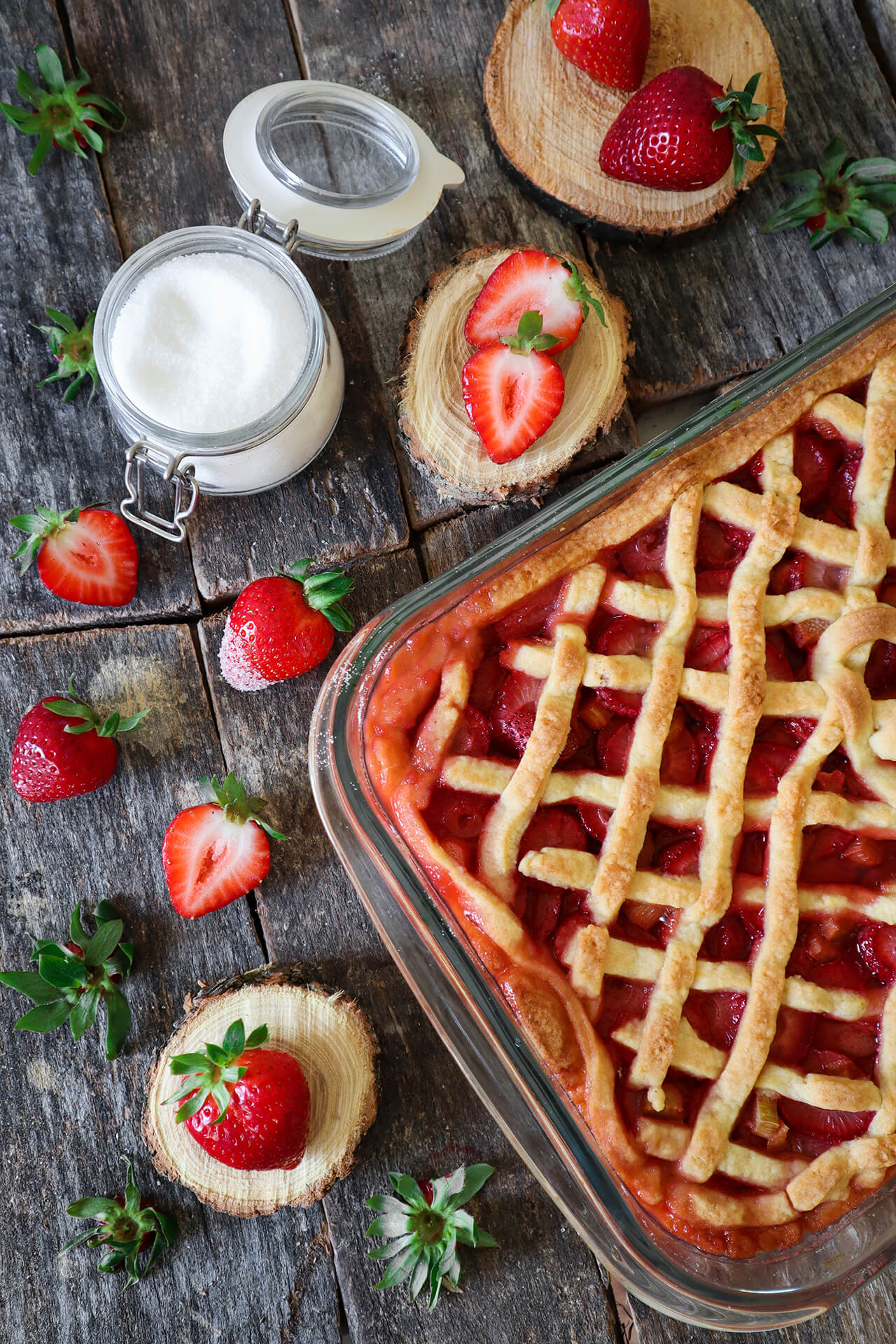 - Jagodama odstranite peteljke i narežite ih na ploškice. Ogulite vanjski sloj stabljike rabarbare te ju narežite na kockice. Pomiješajte jagode, rabarbaru i par žlica šećera i pustite da kratko odstoji dok razvaljate tijesto.