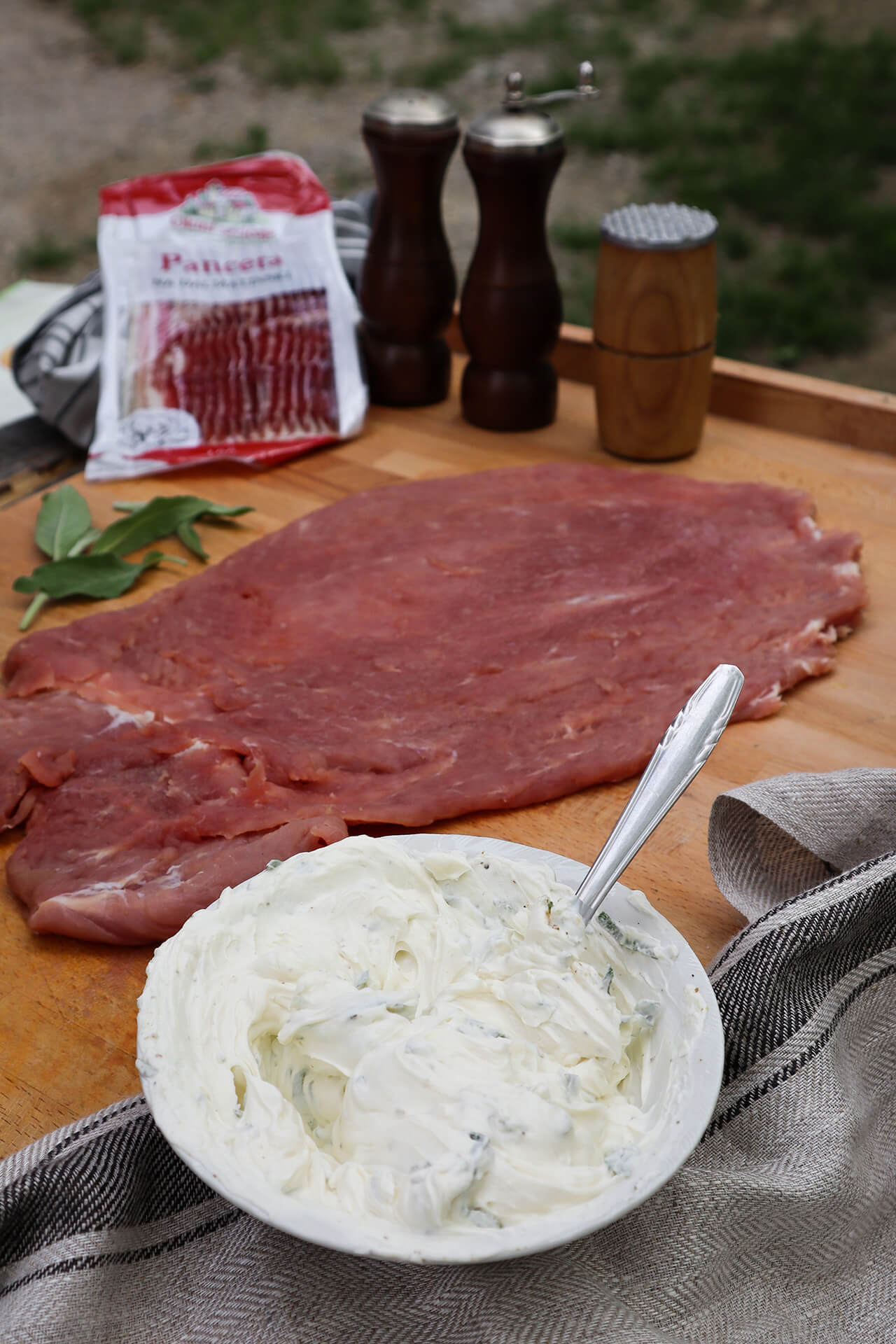 - Pomiješajte u posudi krem sir, nasjeckane listove kadulje, sol i papar. Takvom smjesom premažite jednu stranu lungića kojeg ste prethodno malo posolili.