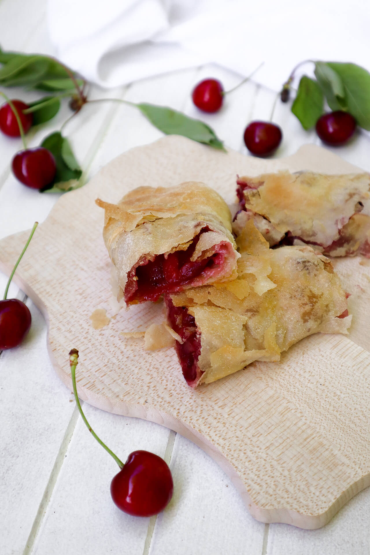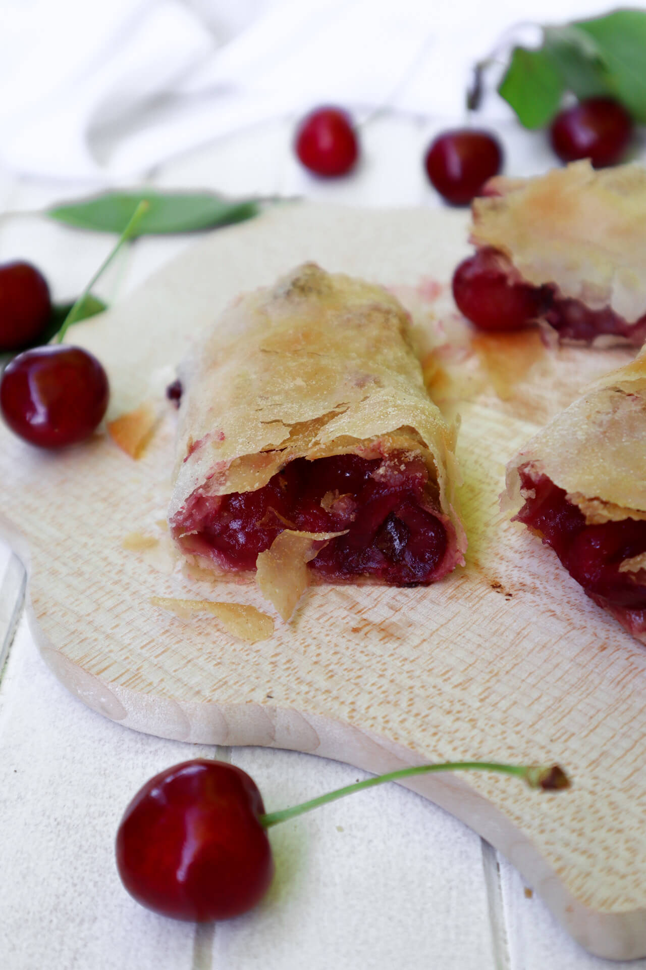 - 1/3 razvučenog tijesta pospite s malo krušnih mrvica, a potom pobacajte trešnje. Otrgnite debele rubove, preklopite bočne stranice te zarolajte tijesto od strane na kojoj se nalaze trešnje,.