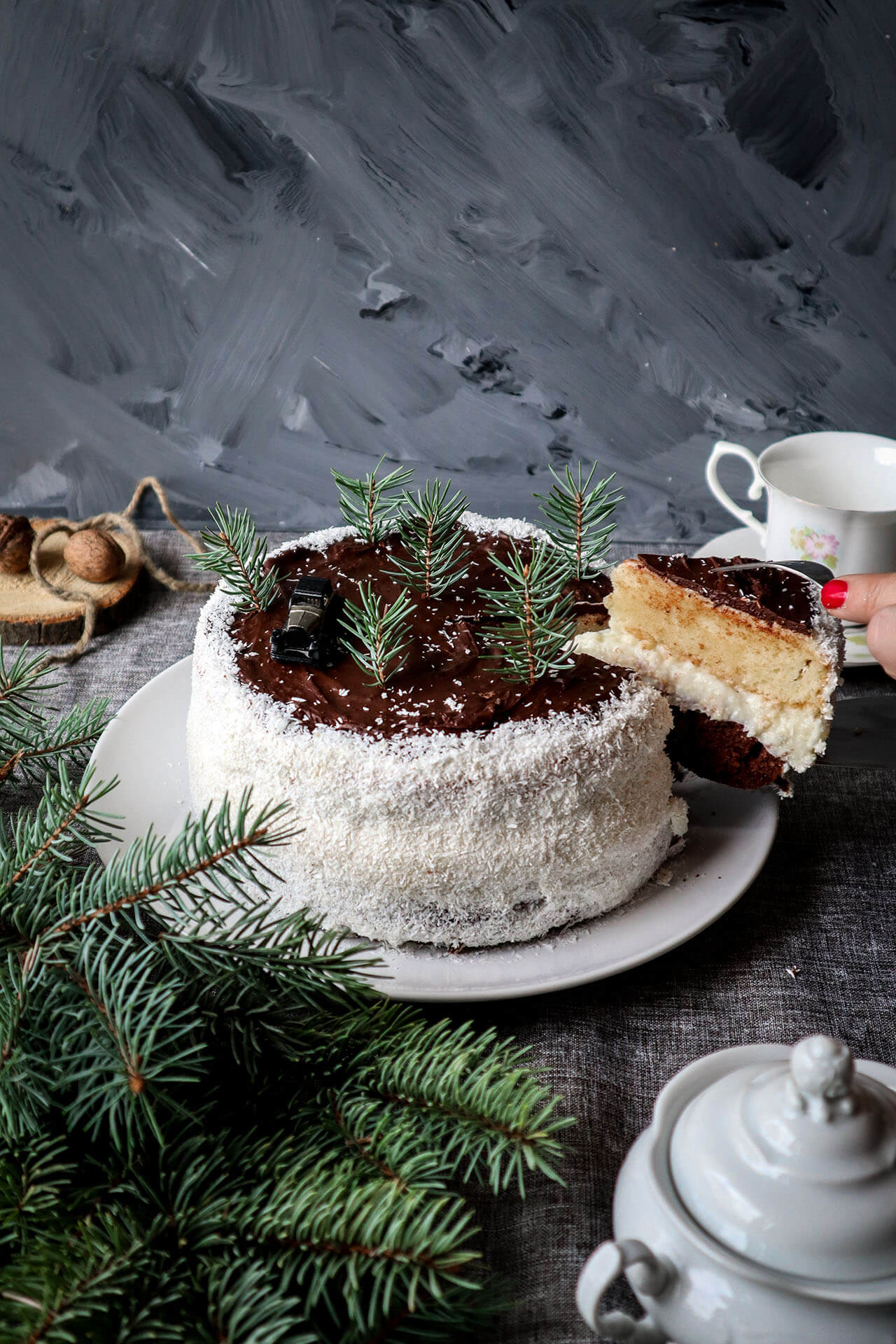 - Biskvite spojite kremom, a i tortu premažite istom. Rukama bočno utapkajte kokos, te po želji prelijte glazurom od čokolade koju ste napravili tako da ste u 10 dg čokolade dodali žlicu mlijeka i žlicu maslaca i sve otopili na pari.