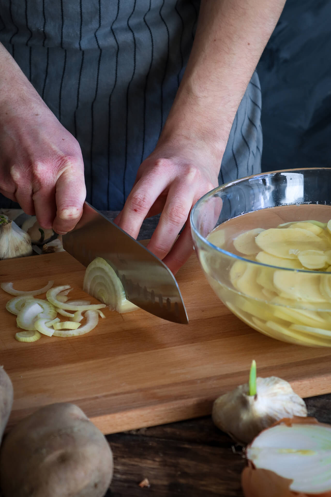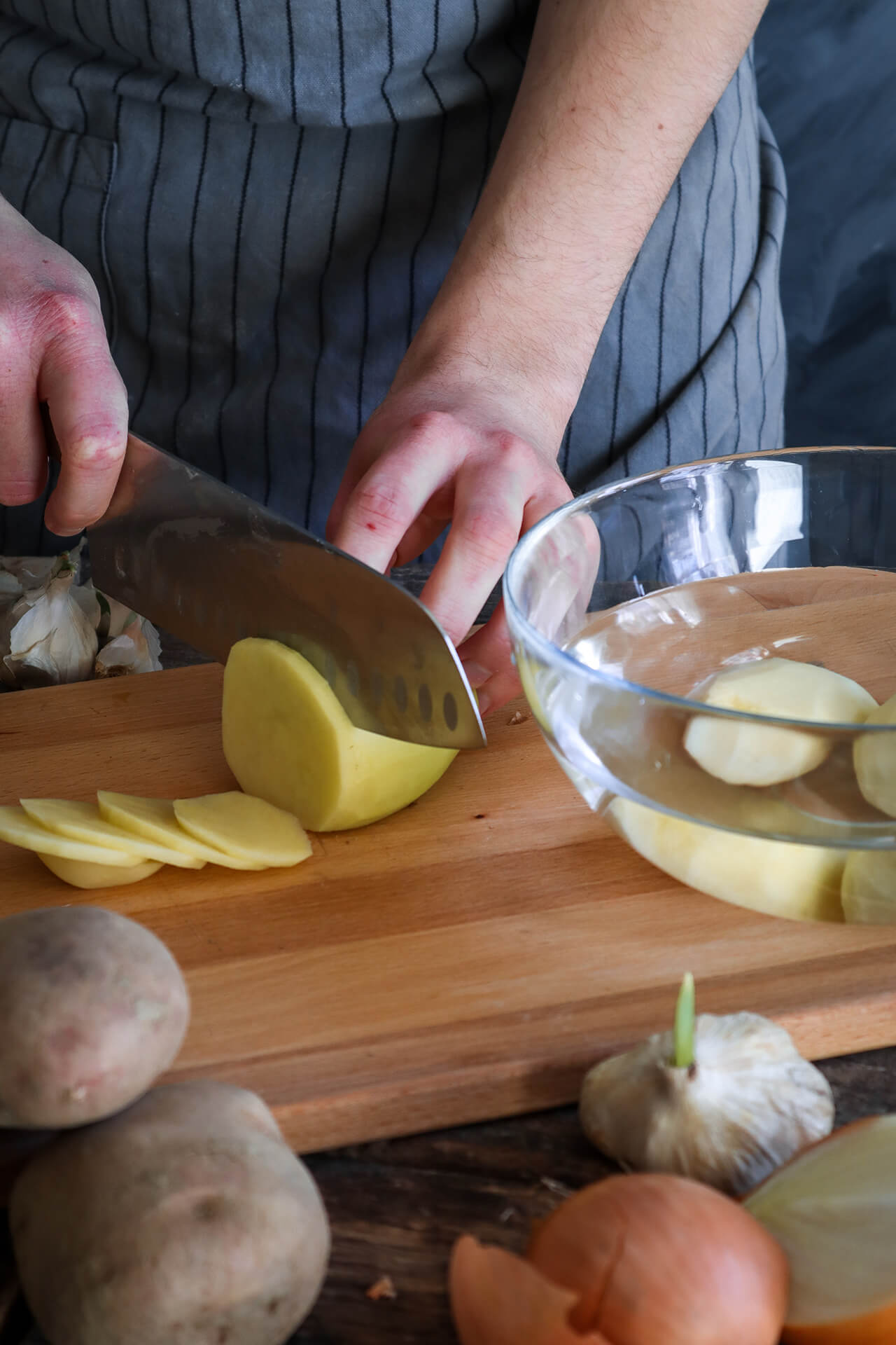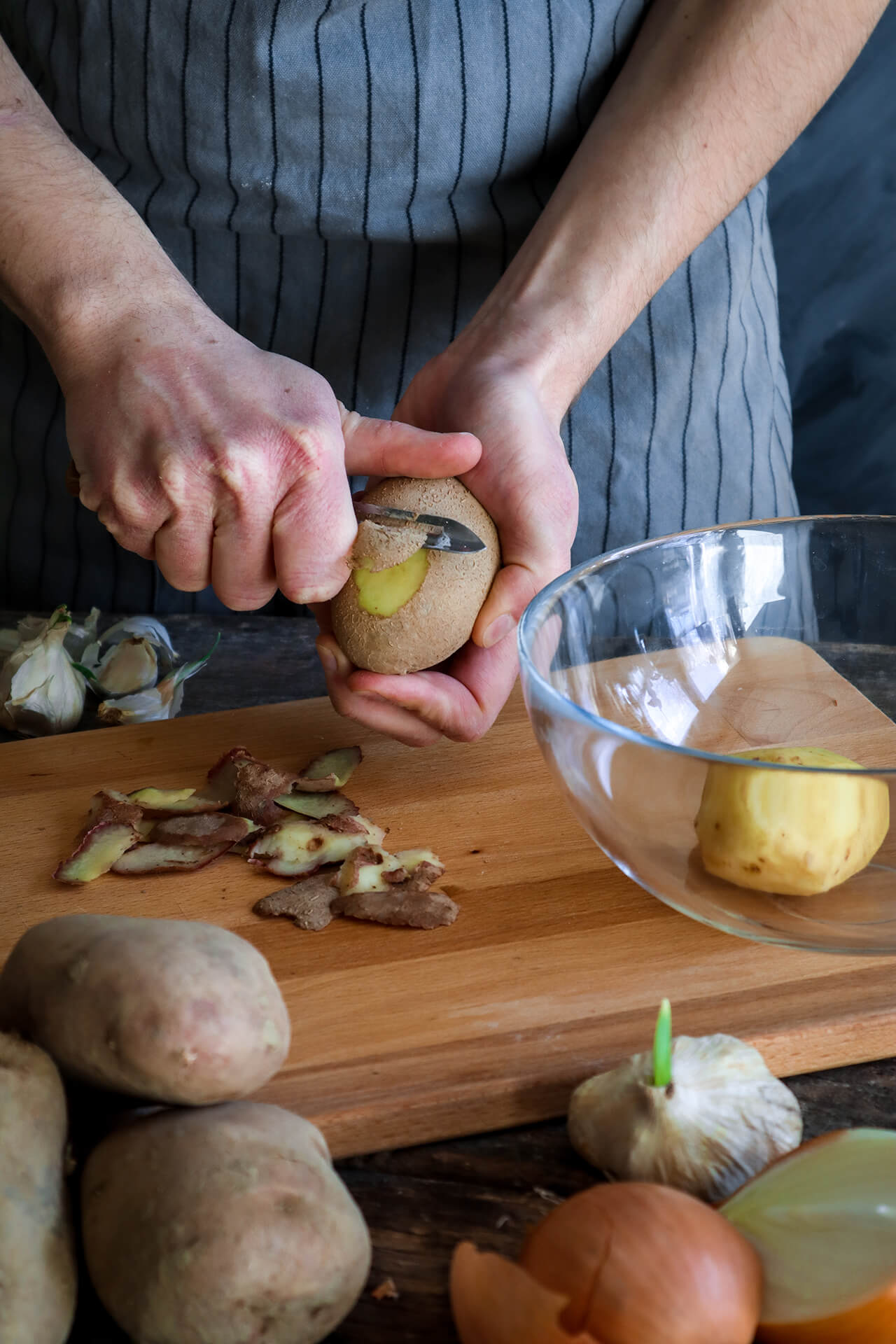 1. Krumpir i luk narežite na ploškice debljine 1 cm. Na srednje zagrijanom ulju (ulja stavite dovoljno da pokrije krumpire kada ih ubacite) najprije popržite krumpir dok malo ne omekša, a zatim dodajte luk i pustite da i jedno i drugo u potpunosti omekšaju. Okvirno prvo pržite krumpir 10 minuta, a potom dodajte luk pa pržite otprilike 5 minuta. Pred kraj dodajte češnjak narezan na ploškice (u ovoj fazi možete dodati i špek) te pustite još kratko dok se ne poprži.