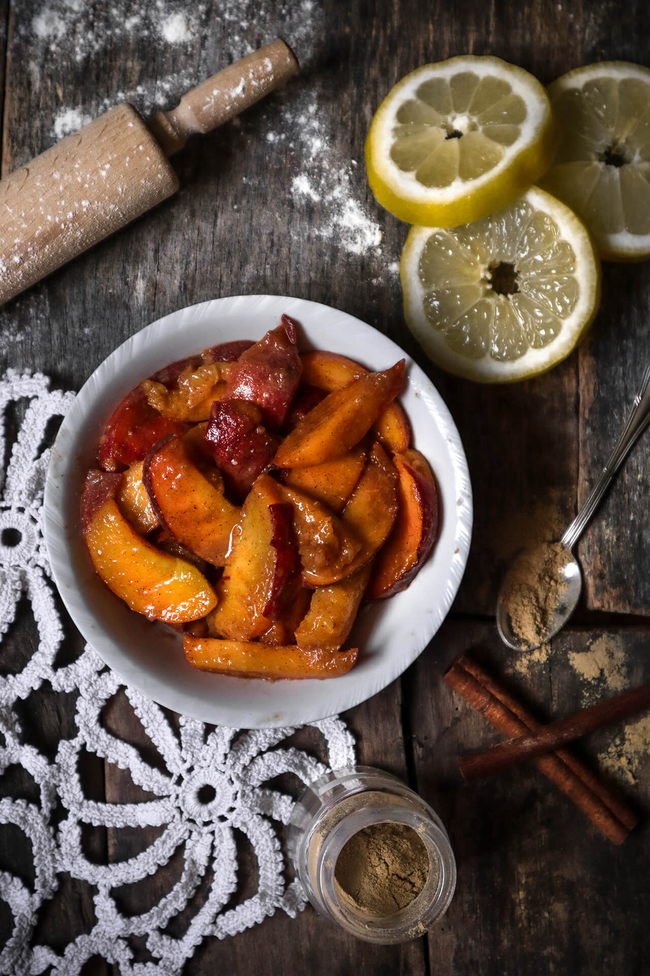 - Breskve operite i narežite na tanke ploškice a potom pomiješajte s vanilin šećerom, začinima, limunovim sokom i žličicom brašna.